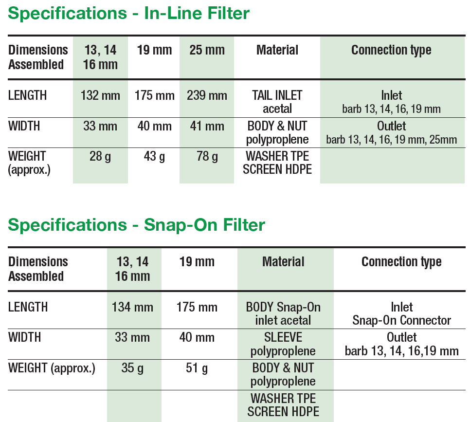 • In-Line model with barbed inlet and outlet.