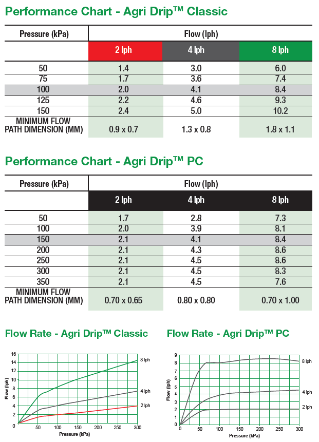 Antelco Agri Drip™ emitters are a range of turbulent labyrinth drippers available in 2, 4 or 8 litre per hour flow rates, in either standard (non compensating) or pressure compensating versions. They have positive barb connection to suit 4mm ID tube or for installing in PE pipe, UV stabilised materials for long life and are resistant to common agricultural chemicals and fertilizers. Recommended operational pressure range is between 100 and 350 kPa (15 to 50 psi).