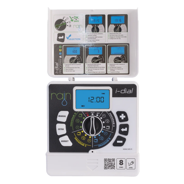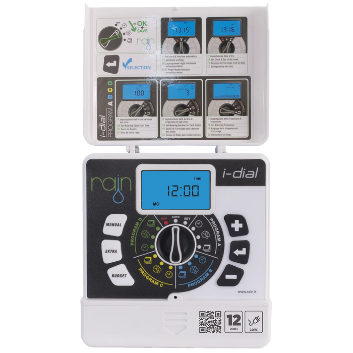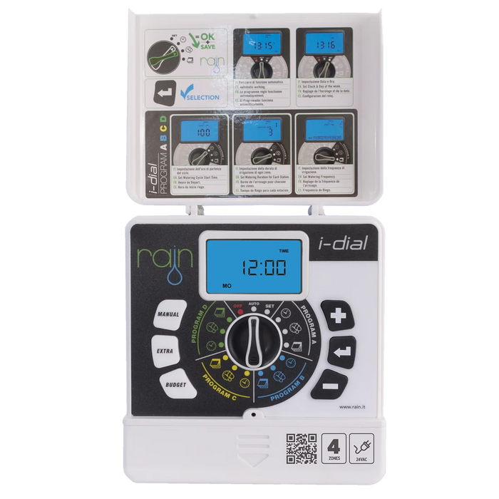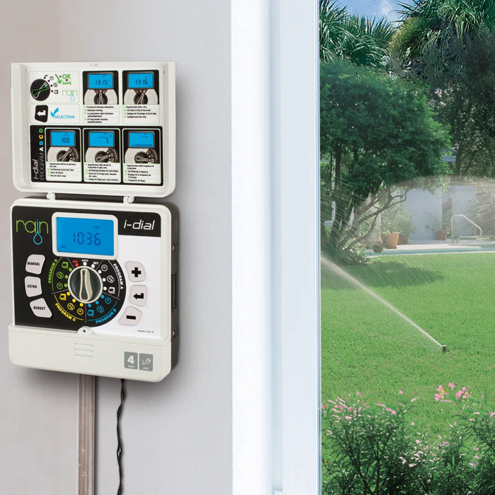 I-Dial Indoor is a full-function control unit designed for flexible system management. Its versatility makes it ideal for residential as well as sports and municipal applications. It can control up to 12 solenoid valves with 4 programs and 1 start each. The easy 3 Easy Steps programming methodology allows you to change the programming in just 60 seconds. In addition, extra functions allow for management of the rain sensor and pump.